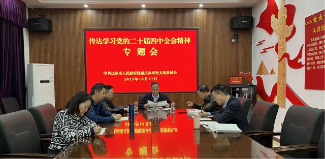会议要求,要领会全会精神。学习宣传贯彻党的二十届四中全会精神是当前和今后一个时期的重大政治任务,要把学习贯彻全会精神与贯彻落实习近平总书记视察四川重要讲话重要指示精神结合起来,锚定“十五五”主要目标和战略任务,主动对标对表,谋划好、推动好办事处工作。要讲政治守规矩。坚持以党的政治建设为统领,在学深悟透党的二十届四中全会精神上下功夫,坚决把思想和行动统一到全会重大决策部署上来,以实干实绩实效坚定拥护“两个确立”、坚决做到“两个维护”。要履行主责主业。以学习贯彻党的二十届四中全会精神为办事处事业发展注入强大动力,推动办事处政务服务、信息收集、招商引资、流动党员管理服务等工作规范化、制度化和专业化。聚焦招商引资主责主业,围绕达州“3+3+N”产业需求,坚持大抓工业、重抓制造业,按照立足重庆、辐射周边、面向全国的工作思路拓展延伸招商引资路径,主动“走出去”、热情“请进来”宣传达州资源、推介达州产业和投资环境,让更多企业了解达州、关注达州、投资达州。要推进党的建设。落实全面从严治党责任,加强党员干部思想理论武装,强化党组织建设,锲而不舍落实中央八项规定精神,持之以恒正风肃纪,纠治“四风”,巩固风清气正政治生态,营造干事创业的浓厚氛围,为达州“决胜十四五、冲刺三千亿”贡献办事处力量。